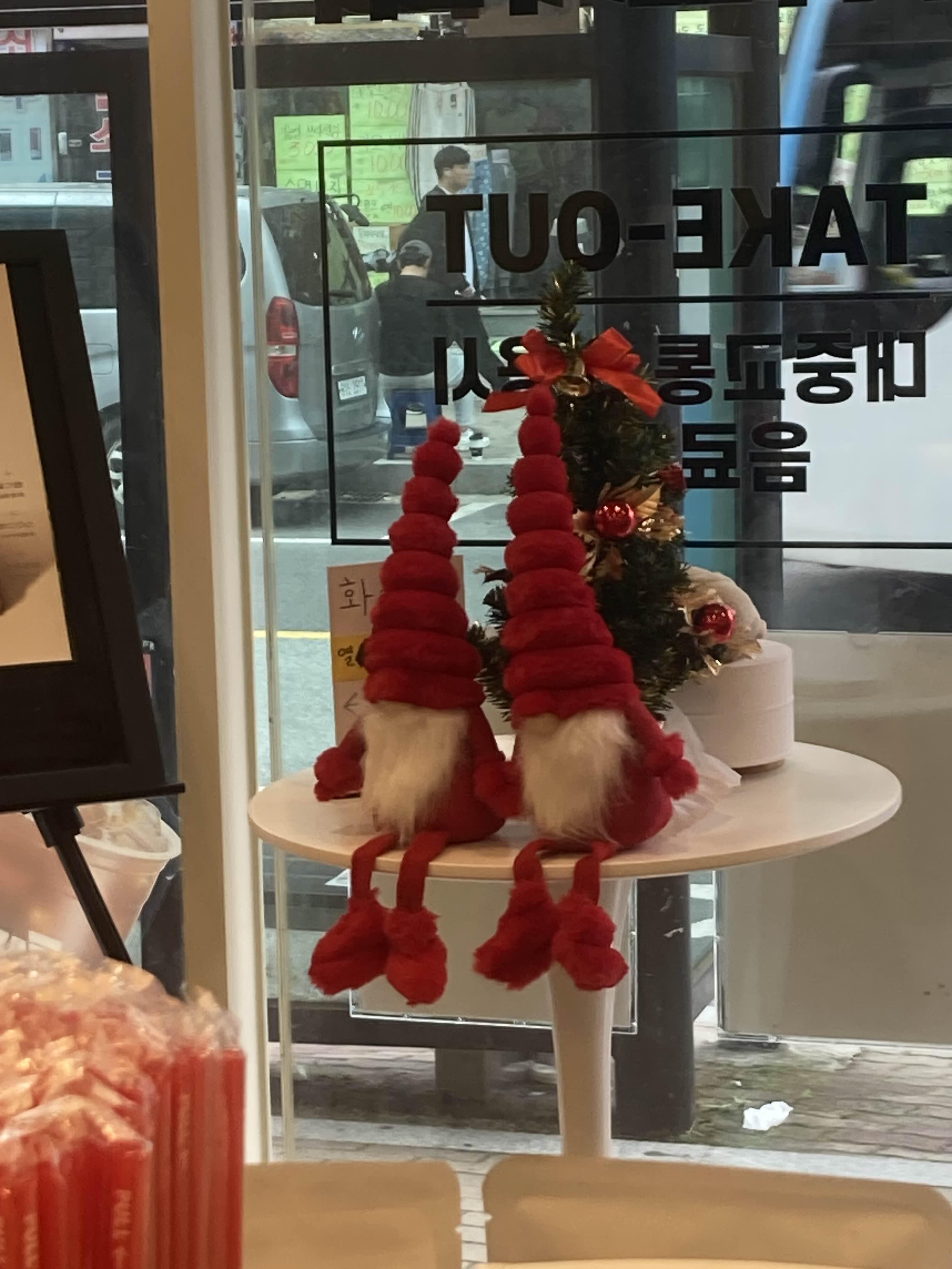 옆에 귀여운 장식들도 있었는데 저 인형두개? 랑 트리가 넘 귀여워서 시선을 뺏김